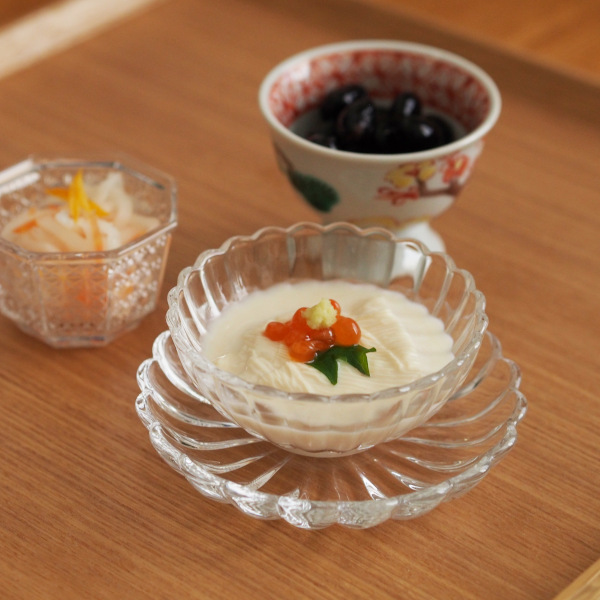 菊華 小鉢・皿セットは、φ10cmの皿と、φ7.2cmの小鉢で小ぶりなサイズ感。重ねて使っても、それぞれ単品でも活躍する万能な組み合わせです。食卓に透明なガラスの器が加わるだけで、ほどよい抜け感が生まれて盛り付けがすっきりと美しく見えるのも魅力。深さのある小鉢は汁気のある副菜やデザートにもおすすめです。今回はお正月の残りを少しずつ盛り、お盆にまとめてみました。ハレの日でなくても、ちょっとした使い方の工夫で自然と背筋が伸びる、凛とした食卓に仕上がります。