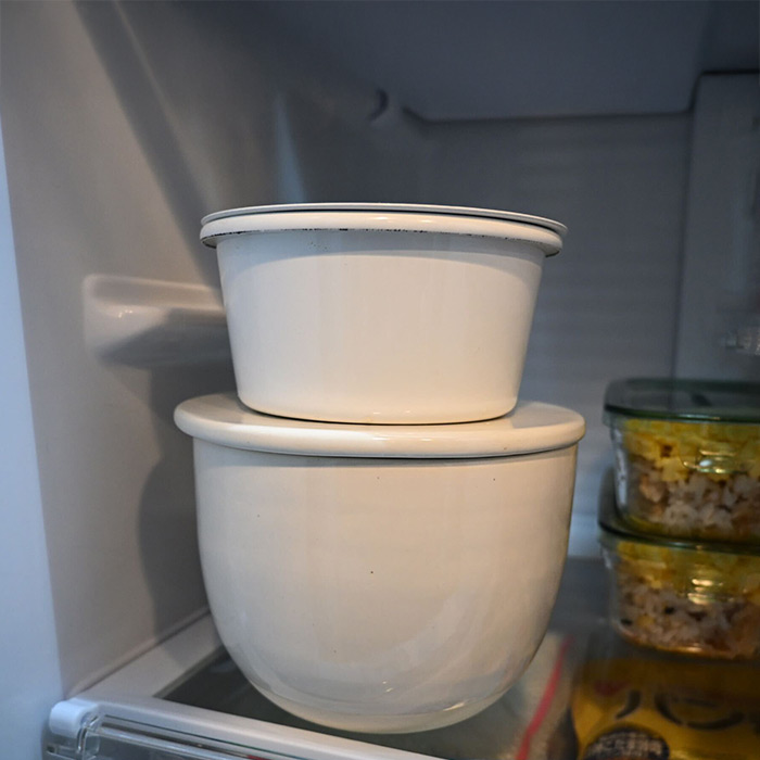 お米はまとめて炊いて2日くらいで食べ切るルーティンなのですが、ごはんの保存って意外と重要。そう思わせてくれたのが、かもしか道具店の陶の飯びつ。この陶のおひつは電子レンジ可!忙しい朝にも気軽にごはんを温められて◎土の力を活かした調湿性により、次の日でもごはんを美味しく頂けます。蓋はフラットなため、重ねて冷蔵庫に収納もできる優れ者。炊き立てごはんをおひつに入れると底面から水分が蒸発するため、木のテーブルには鍋敷きなどを敷くのがおすすめです。