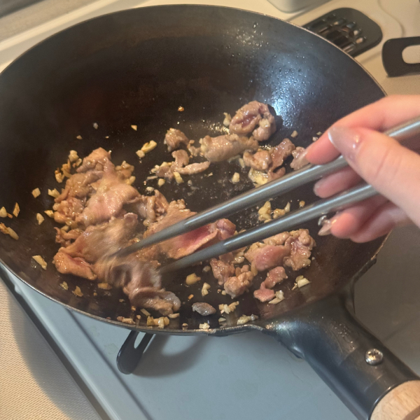 1.6mm厚の鉄片手中華鍋は、手に取った瞬間に安心感があります。程よい重さと木製ハンドルのバランスが良く、空の状態でコンロに置いても、持ち手の重さで傾く心配がありません。しっかりと熱を蓄えてくれるので、最初に炒める豚肉もくっつきにくく、調理がとてもスムーズです。1〜3人分の炒め物にちょうどよく、気づけば毎日のように使っている、我が家の定番炒め鍋です。