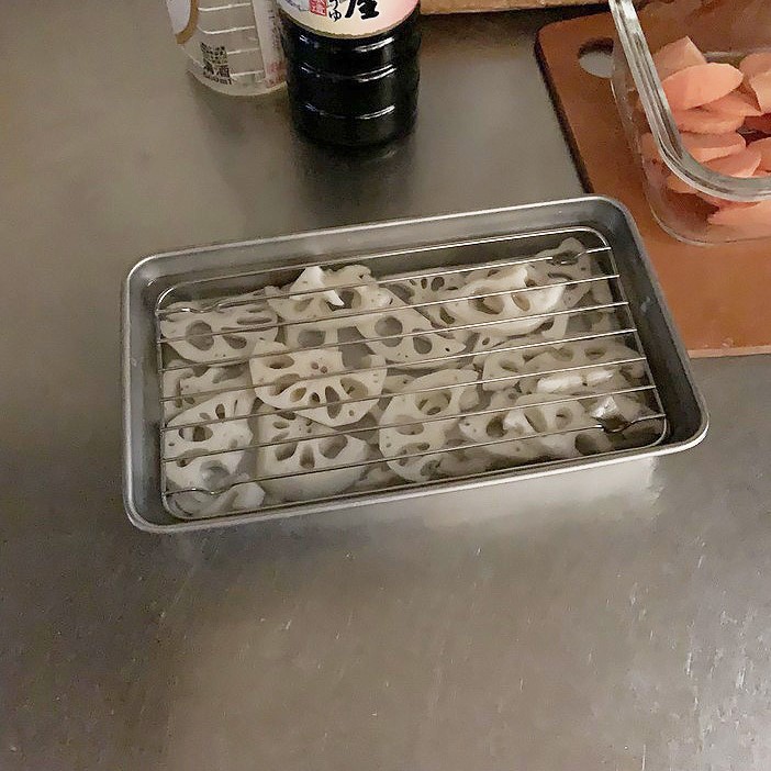 白いホーローバットは、すっきりとした清潔感があって、食卓にそのまま出しても違和感のない佇まいが魅力です。別売りのバットアミを合わせて使うと、食材の余分な水分を切りながら並べられるのも便利なところ。お肉や海鮮、野菜を少しずつ盛りつけるのにちょうどよく、一人分の焼き肉プレートとして使いやすいサイズ感です。下ごしらえの時間から食卓まで、気持ちよく使える頼れる道具だと思います。