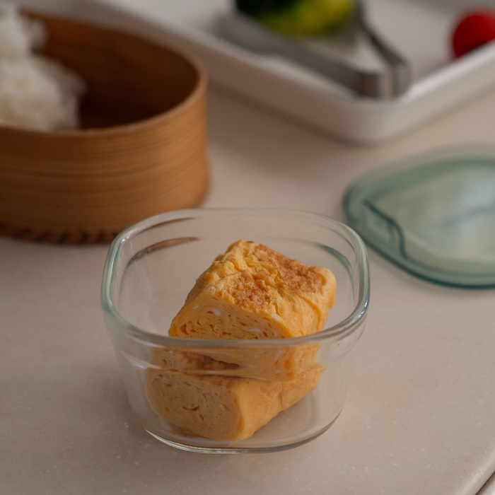 イワキのパック&レンジで一番小さいサイズは、ちょっと残ったものを保存したいときに重宝します。もうすぐ6年間続いたお弁当作りも終わるのですが、途中からは娘一人分になり卵焼きを作るといつも少し余っていました。そんなとき、この容器に入れて粗熱を取りそのまま冷蔵庫へ。翌朝はそのまま詰めればOKという楽を覚えてしまいました(娘よ、作りたてじゃなくてごめん…でも美味しいよね?)。ガラス製は匂い移りもなく、冷蔵庫の中でもすぐ探せるのも嬉しいポイント。清潔に保てるところも気に入っています。