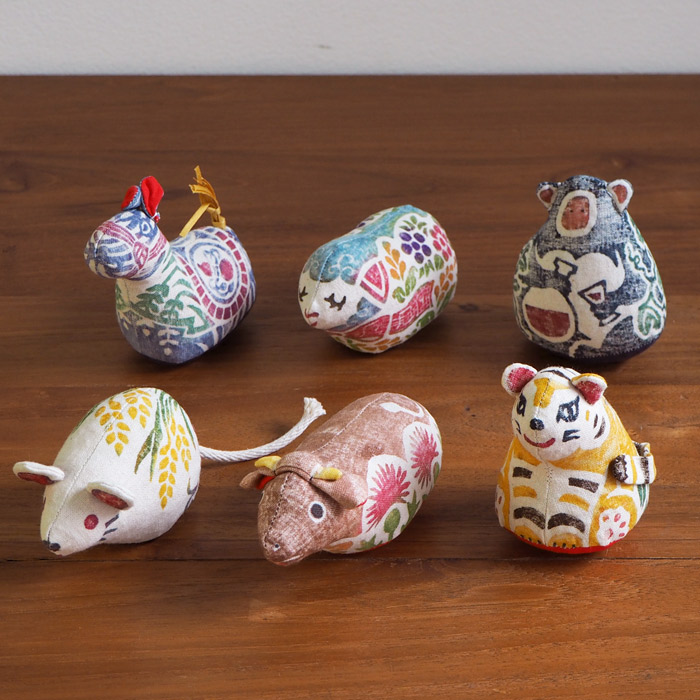 飛騨高山の工房で作られている、素朴な味わいが魅力の木版手染めぬいぐるみ。こちらは十二支シリーズのこどもセットです(ひつじは青色のシャイになります)。