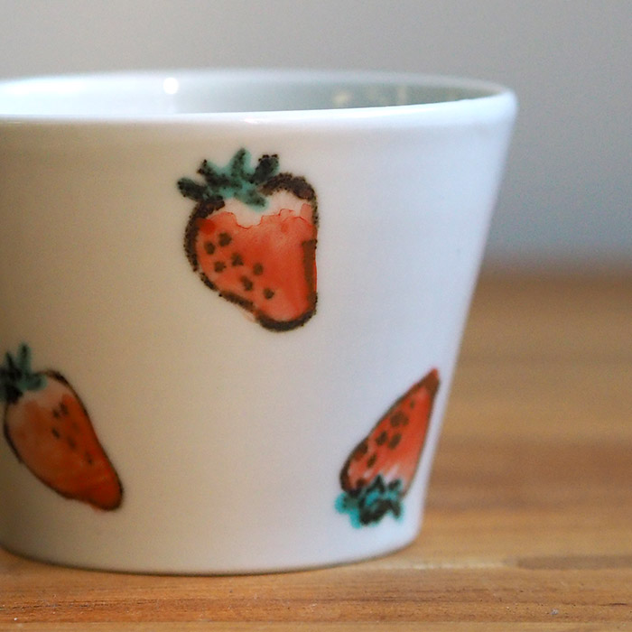 いちごモチーフというと甘めの可愛らしいイメージが湧きますが、堀畑さんがこだわったのは「甘くなりすぎず、でもいちごの可愛らしさは失われないよう、あえてリアルに表現すること」。九谷焼の赤い絵の具で色の濃淡を丁寧に描き、今にもひとつ摘んで食べれそうなほど瑞々しいいちごを描いています。蕎麦猪口の周りをいちごが転がるように向きをバラバラに配置し、内底にはカットされたいちごがコロンと。視覚的にも食事の時間を楽し気にしてくれる器です。