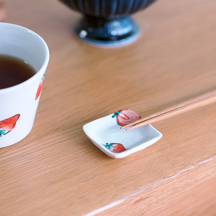 いちごモチーフというと甘めの可愛らしいイメージが湧きますが、堀畑さんがこだわったのは「甘くなりすぎず、でもいちごの可愛らしさは失われないよう、あえてリアルに表現すること」。九谷の赤い絵の具で色の濃淡を丁寧に描き、今にもひとつ摘んで食べれそうなほど瑞々しいいちごを描いています。4つの箸置きはそれぞれデザインが異なり選ぶ楽しさも。半分にカットされたいちごがあったり、上から見るとモチーフが途中で切れてしまっているように見えても、横から見るときちんといちごとしての完成形がそこにあり、堀畑さんらしい遊び心とこだわりが落とし込まれています。