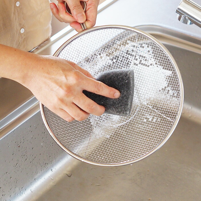 新潟県燕三条で作られる丈夫なステンレスを編み込み、さらにワイヤーで補強。頑丈に作られているから、使っているうちに歪んだりすることもありません。使用後はスポンジに中性洗剤をつけて手洗いで。粗めのメッシュだから汚れ落ちも抜群で、洗った後も数回振れば水切りまで完了します。