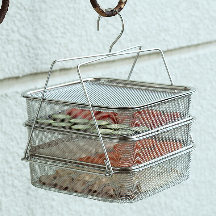 使い終わったら食洗機でのお手入れが可能で、いつも清潔にお使いいただけます。干しかごとしてだけでなく、水切りかごや洗いかごとして使うこともでき、ますますこの四角いザルが魅力的に見えてきます。どうやら、この干しかごの登場で、これまで以上に干し野菜が広く普及する予感です。