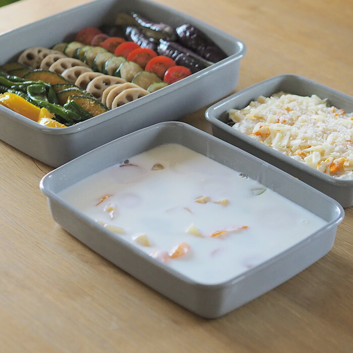 調理道具として使える点も野田琺瑯の保存容器の魅力です。耐久性・耐熱性に優れていることから、直火調理やオーブン調理がOK。保存しておいたカレーを保存容器のまま直火で温めたり、蒸し器に入れて蒸し調理をしたり、お菓子の型としてオーブンでケーキを焼くことも楽しめます。