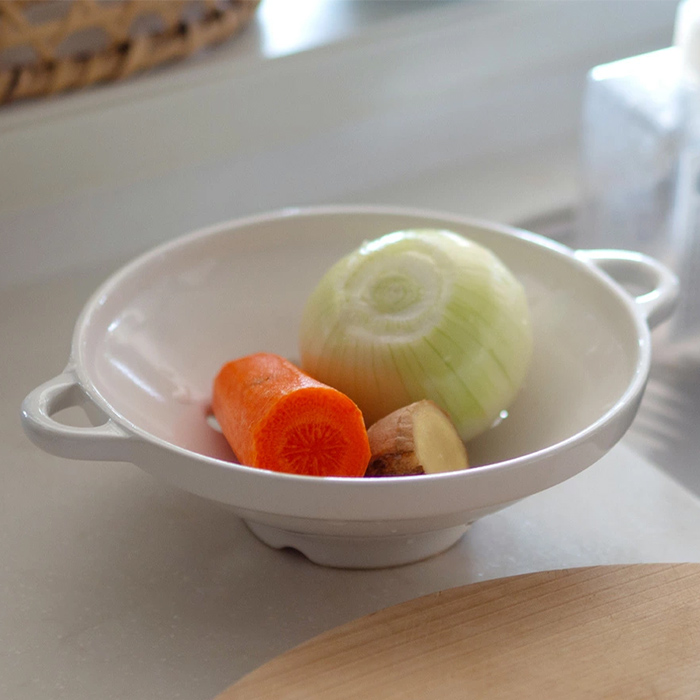 コランダーなんて自分には縁がないと思っていましたが、スタジオエムのベリーボウルに出会って考えが変わりました。陶器製で手馴染みの良いサイズ感は、果物や枝豆の水切り、冷やしうどんの器など意外と使い道がたくさん!特にお気に入りは調理中の“ちょい置き”です。洗った野菜や皮をむいた食材を一時的に入れるのに便利で、陶器だからお手入れも簡単で、そのまま出しっぱなしでも絵になります。