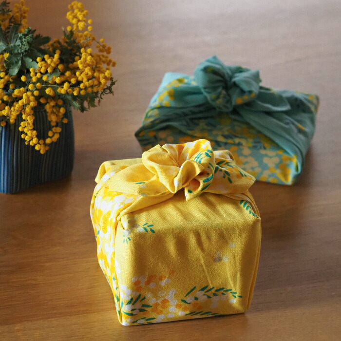 便利とは言え、気持ちを豊かにしてくれるデザインかどうかも大切なポイント。ミモザのブーケをイメージしてデザインされたこの風呂敷には、シルバー顔料を用いたミモザの花をランダムに散りばめアクセントに。浮き立つように描かれた色鮮やかなミモザが風呂敷の魅力をより一層引き立てています。また、ヨーロッパでミモザは寒く厳しい冬が終わり暖かな春の訪れを次げる「幸せの花」とされ、花言葉は「感謝」「思いやり」「真実の愛」。入学式や卒業式などのハレの日、母の日にはこはれの風呂敷でギフトを包んでプレゼントしても喜ばれそうです。