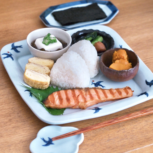 日下華子さんの「色絵つばめ正方角丸プレート」は、朝ごはんの時間をちょっと特別にしてくれる一枚です。おにぎりや焼き鮭、卵焼き、小鉢をいくつか並べてもゆったり収まる広さで、ワンプレートごはんにもぴったり。もちろん山盛りのおかずを盛り付けることもできます!器のあいだから顔をのぞかせるつばめの絵がかわいらしく、思わずほほえんでしまいます。同じ日下さんの木瓜豆皿を箸置きにしたり、八角皿に海苔をのせて添えるのもおすすめです。