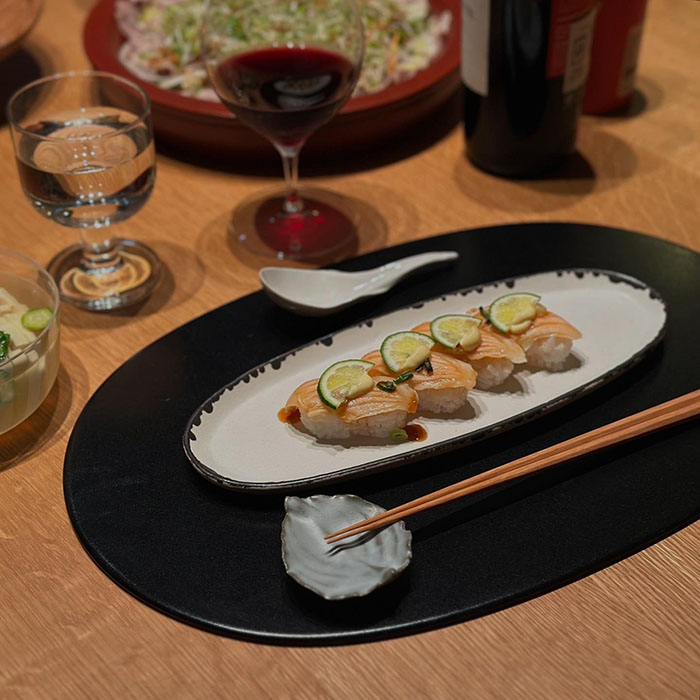 小判盆を一枚置く事でテーブルコーディネートが一気に引き締まります。しかも赤と黒のリバーシブルなので一挙両得。料理やお酒をゆっくりと楽しみたい時は、一皿を潔く置いたり、余白を活かす盛り付けを試してみてください。小判盆に合わせたのは飯高幸作さんの「オーバル皿 白フチ茶」。相性の良いサイズ感と、和食でも洋食でもどんな国のお料理もオシャレに盛り付けられるのが飯高作品のオススメポイント。ちなみに盛り付けたのはスーパーで買ってきた「サーモン寿司」にお醤油をたらしてバーナーで炙り、マヨネーズと酢橘を飾っただけ。
