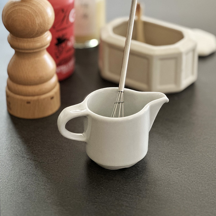 ピリヴィッツのヨーロッパシリーズ「ミルクピッチャー」は100cc。コーヒーなら2〜6杯分のミルクを入れるのにもちょうど良いサイズ感です。でも、我が家ではテーブルでミルクピッチャーとして使うよりも、ドレッシングピッチャーとして使う機会が多くあります。すとんと縦型ボディが調味料も入れやすく、ハンドルに指をかけて家事問屋のミニ泡立てで撹拌すれば出来上がり。少量のドレッシングやタレを作るときについ手に取ってしまう、白くて可愛い器です。
