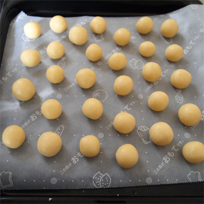 まとめた生地を20等分にして、手のひらでクルクルと丸め、オーブンペーパーを敷いた天板に並べる。3 -