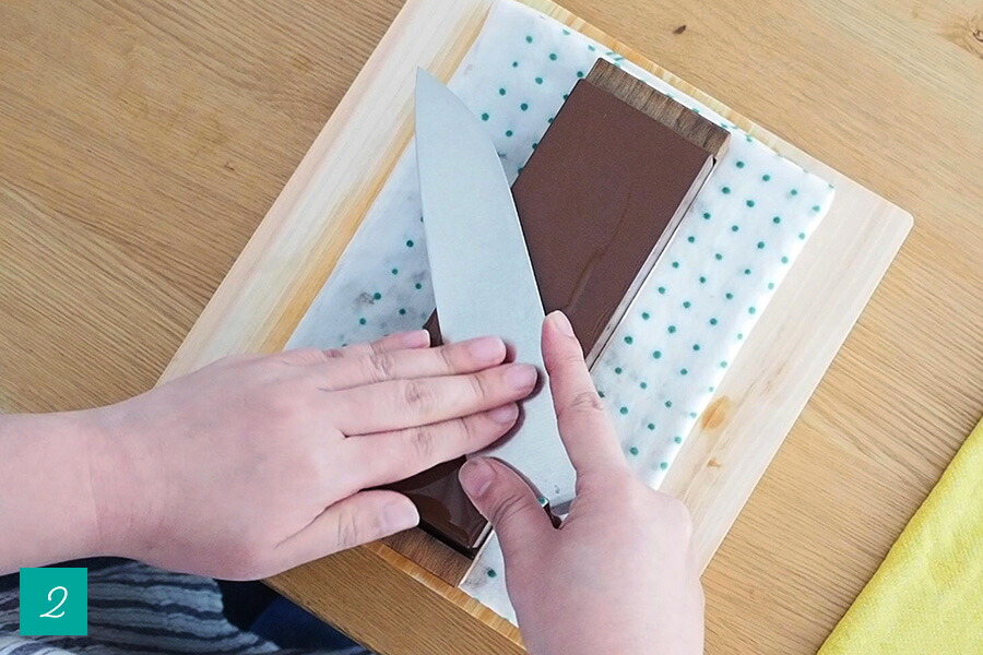カエリは包丁と砥石が擦れ合って包丁の刃先がめくれあがってきた部分です。指の腹で触ったときに、ざらっと感じたらカエリがついている証拠です。包丁の刃の全体にカエリがつくまで研いでください。ザラつきを感じない部分は、もう一度研いでください。全体にカエリがついたら次の工程に進みます。