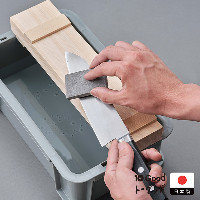 - 研ぎやすいように高さを出し、作業中に砥石が滑らないように固定させる台と濡れふきん